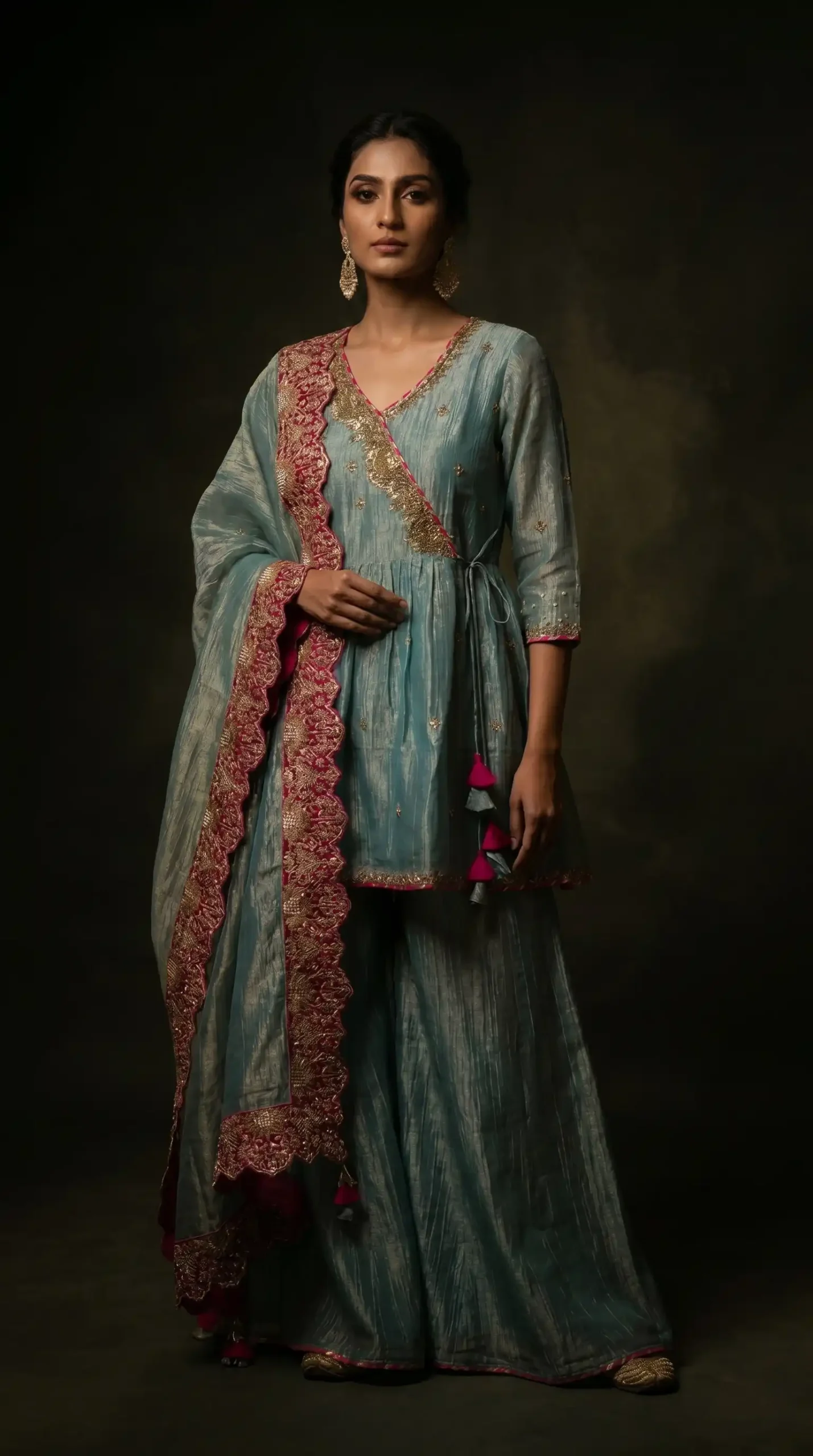 Beautiful crush tissue simar fabric angrakha pattern dress paired with a flowy palazzo set, featuring intricate handwork detailing. Comes with a matching crush palazzo and dupatta adorned with delicate heart-inspired handwork. A perfect blend of elegance and comfort, making it a summer-friendly party wear ensemble with a sophisticated designer appeal.