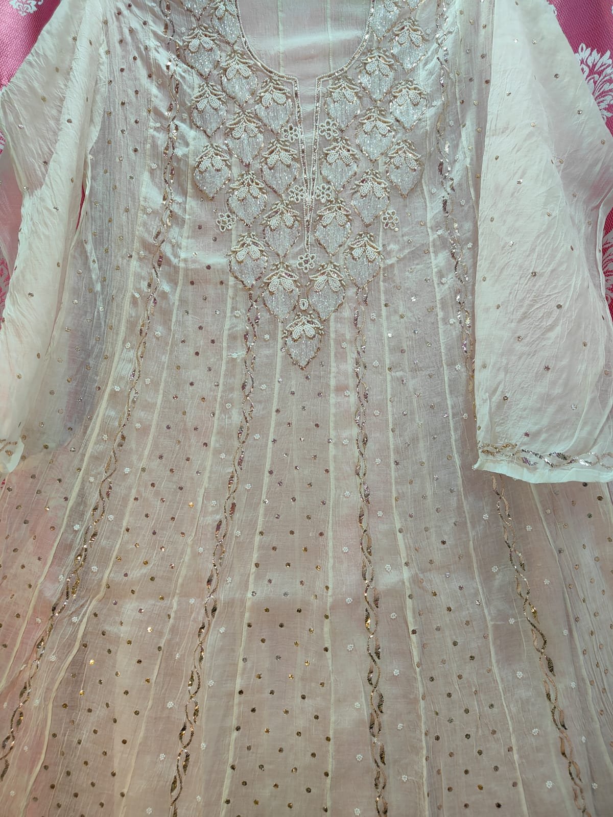 Lucknowi chikankari anarkali crafted on pure mul chanderi fabric can be custom dyed in any color of your choice. Featuring delicate hand embellishments and intricate mukaish work detailing, this ensemble blends timeless craftsmanship with breathable comfort. The lightweight mul chanderi makes it perfect for summer, while the refined handwork adds a touch of traditional luxury—ideal for festive and elegant wear.